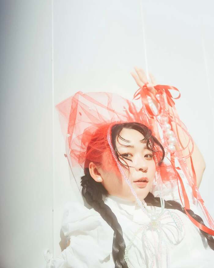 そこには、おさげの三つ編みに、赤いチュール素材のヘアアクセサリーを頭に巻いたアンゴラ村長さんの姿が。