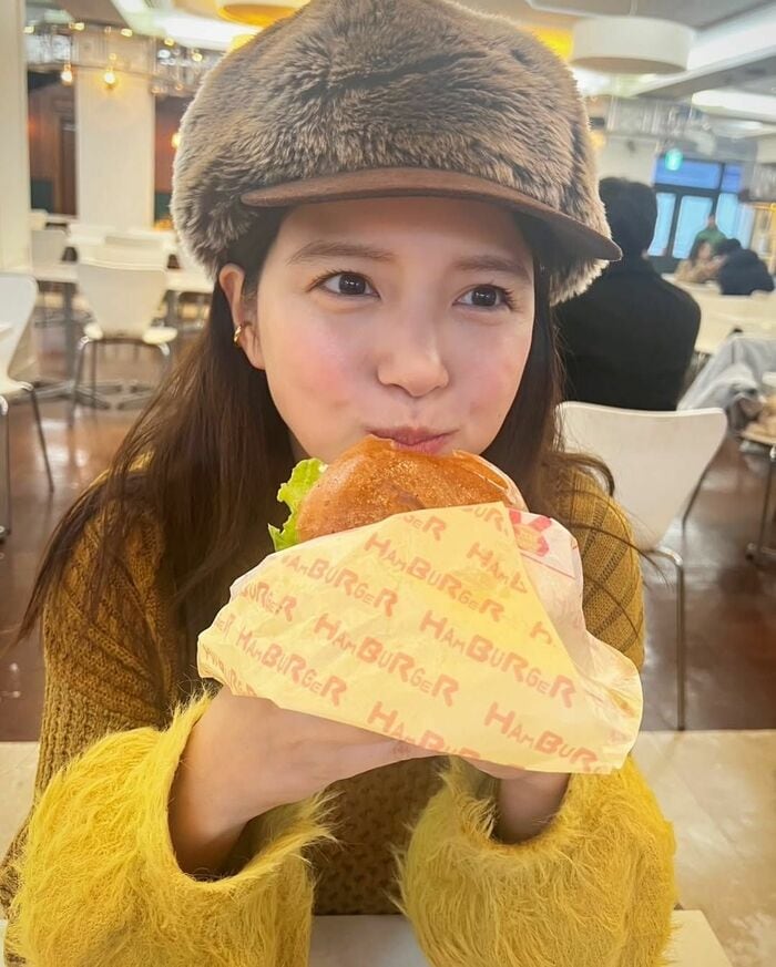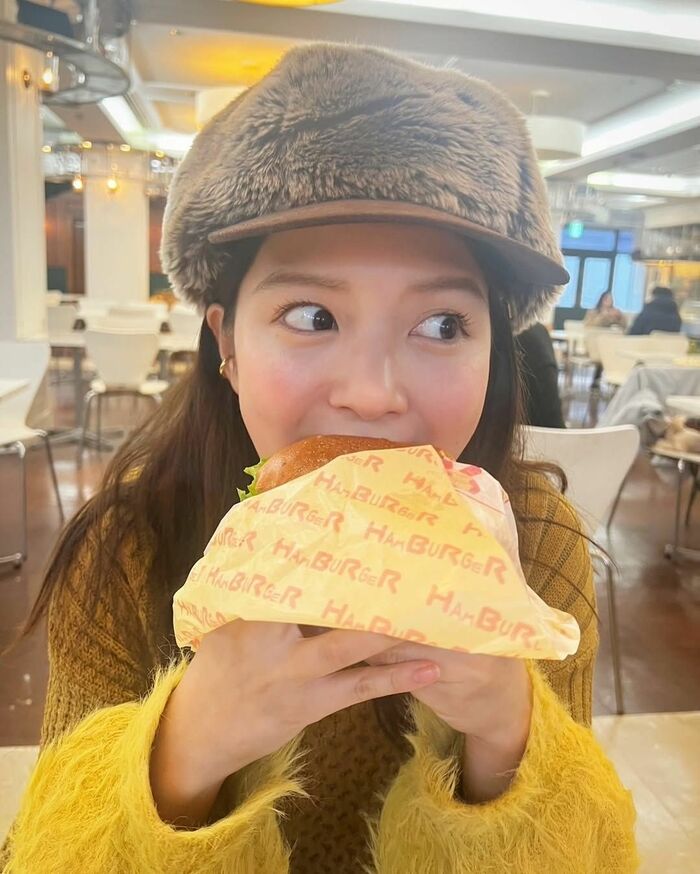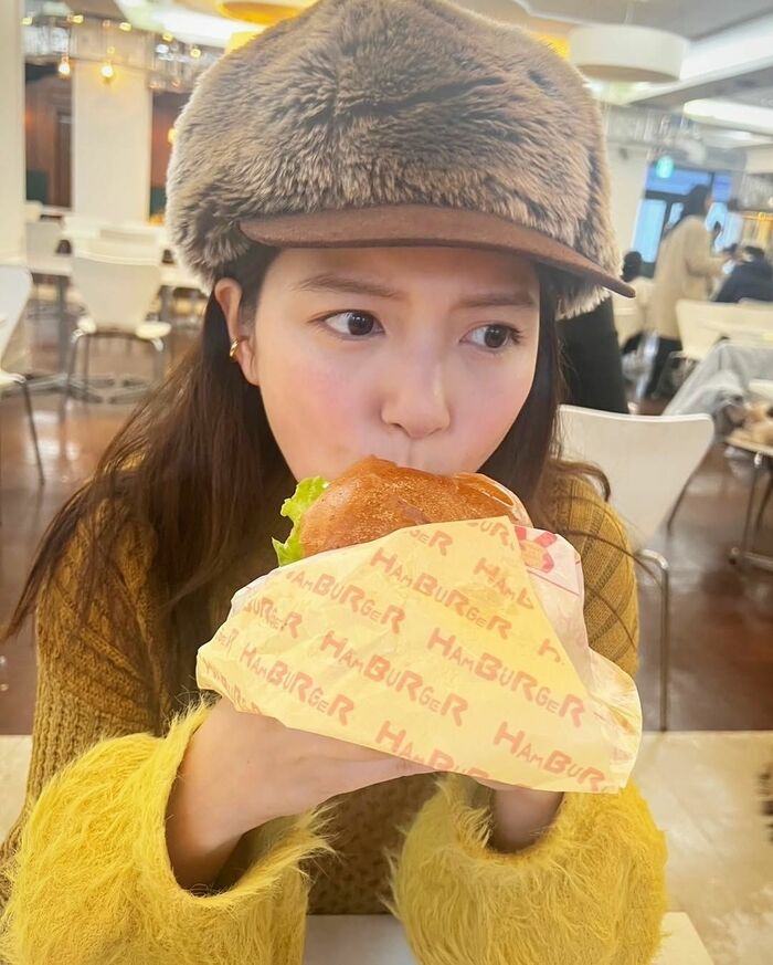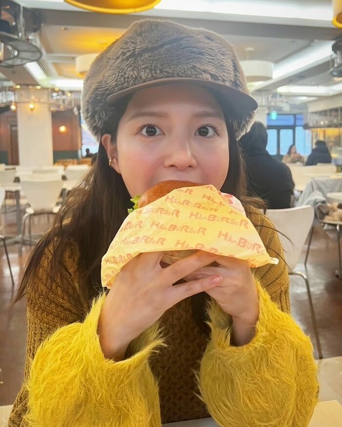 投稿文で「食欲が止まらない…どうしよう……」とハンバーガーの絵文字とともにつづり、大きく口を開けてハンバーガーを頬張るショットを公開しました。