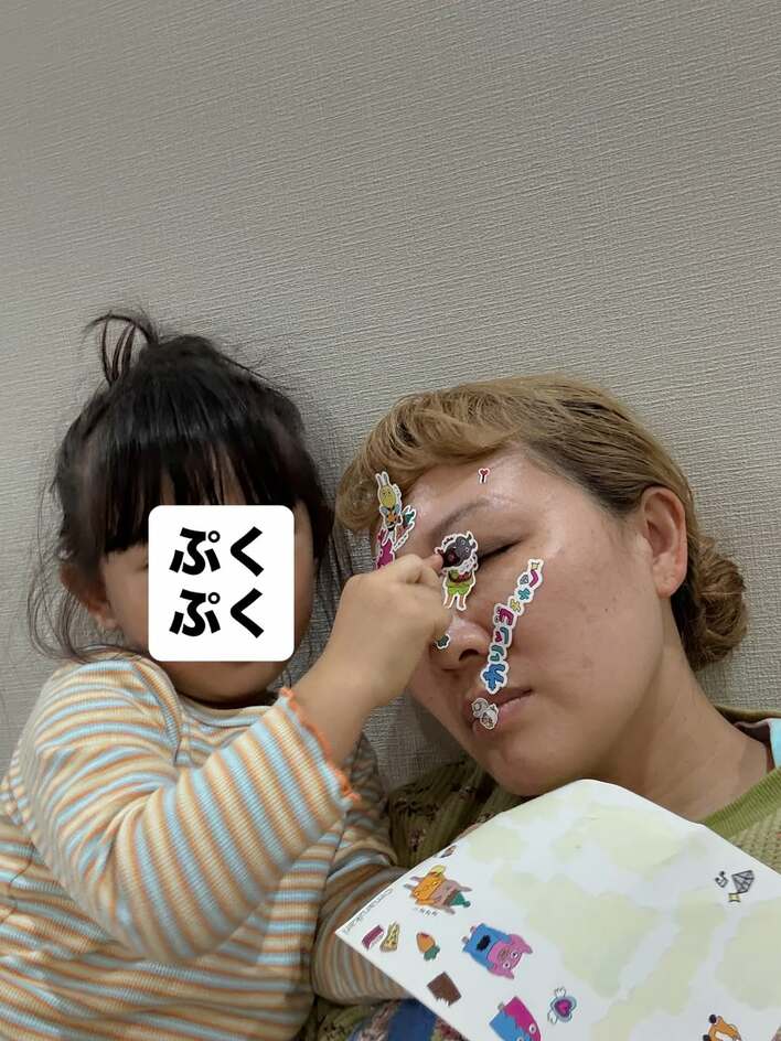 疲れて眠るママの顔面にシールをペタペタと貼りまくるとんでも行動に!