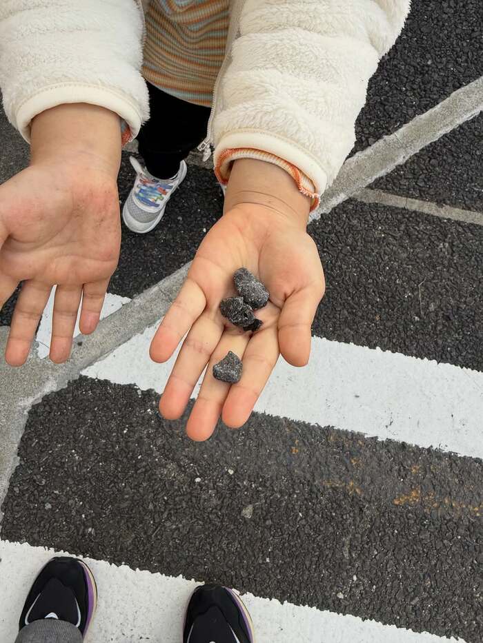 すると次の写真では、ぷくぷくちゃんの手のひらに乗った小石の写真が。