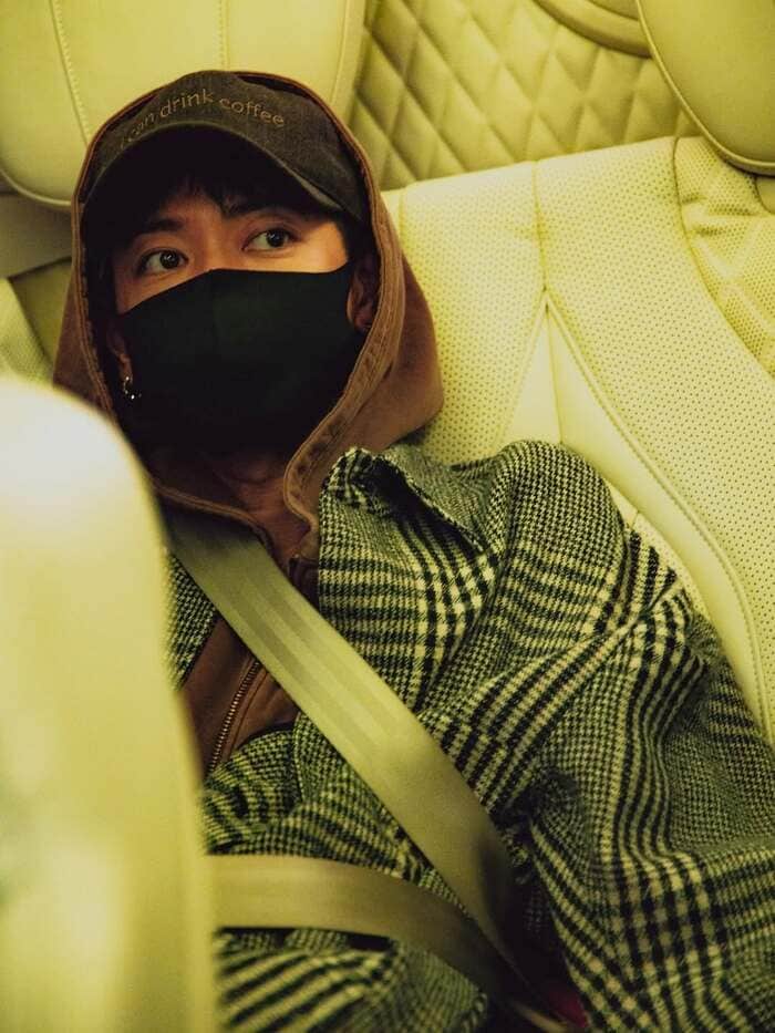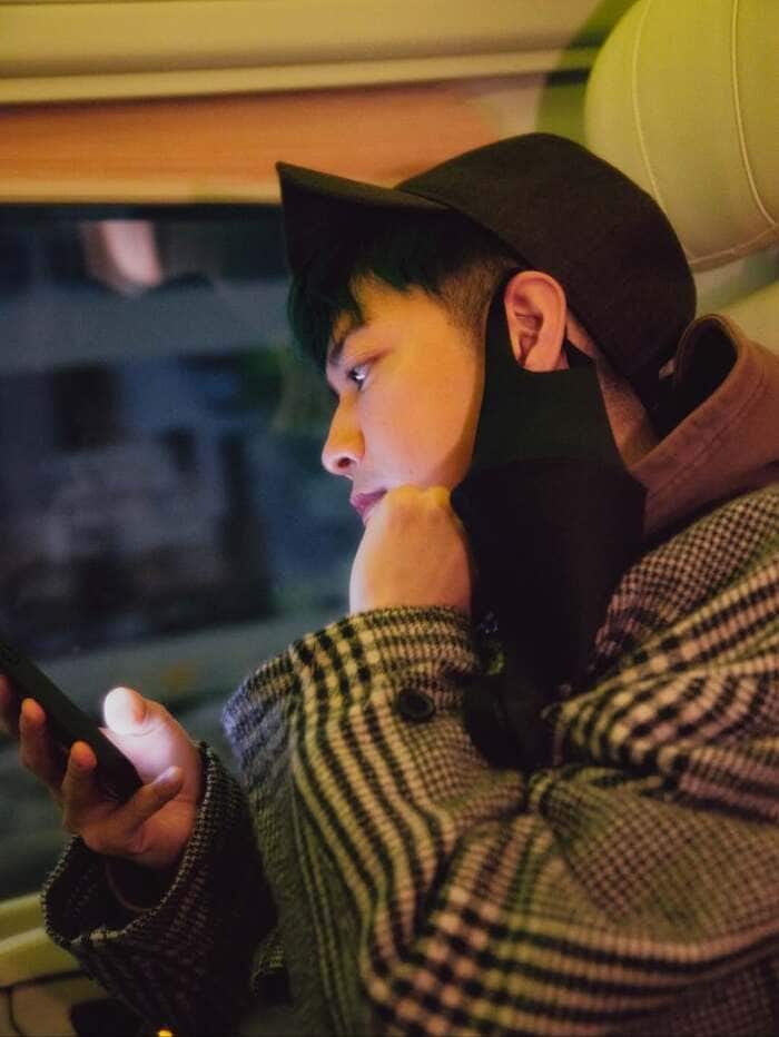 マスクを少しずらして、スマホの画面を見つめるショットも。