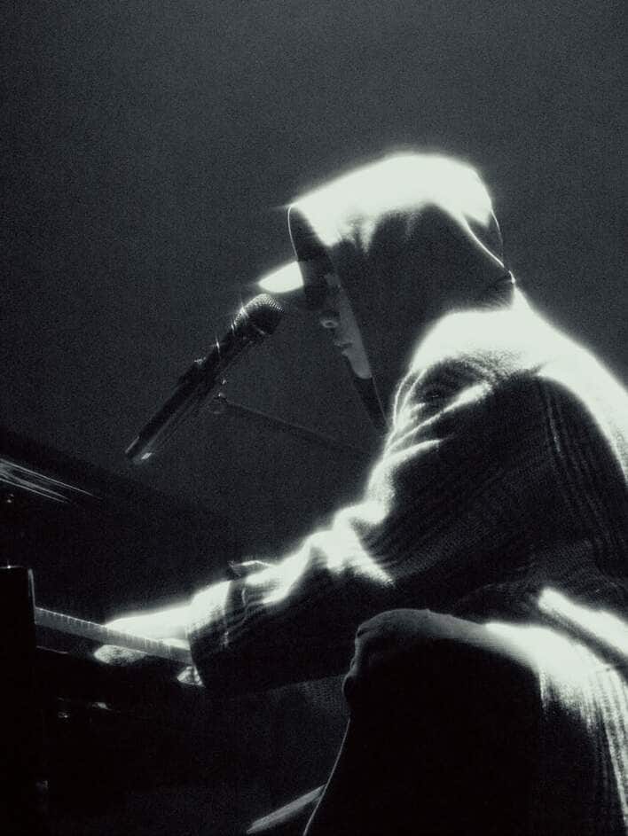 パーカーのフードを深くかぶり、真剣な表情で演奏している様子は、モノクロ写真のような色合いで、クールな雰囲気があふれています。