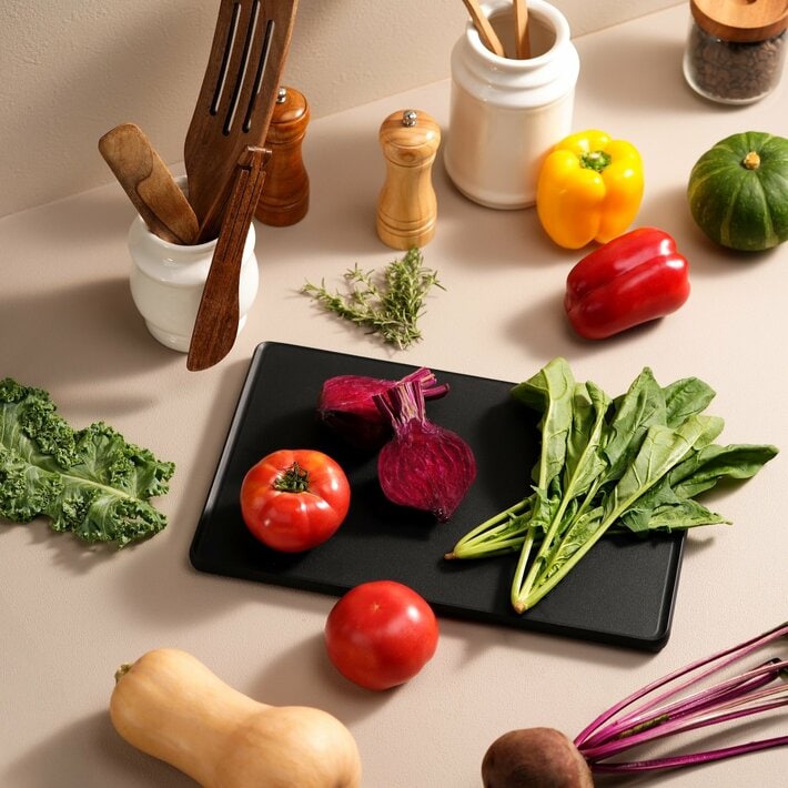 キッチンに吸い付くような新素材と、まな板の左右に施された3.0mmの縁がストッパーの役割を果たし、ダブル効果でまな板が滑りません。