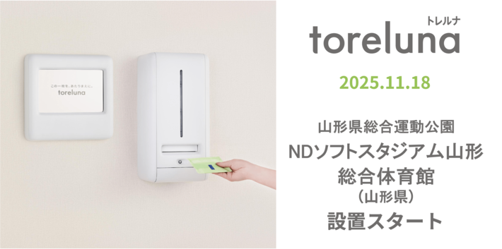 株式会社ネクイノ(大阪市北区、代表:石井 健一)は、トイレの個室で生理用ナプキンを常備し無料で提供するサービス「toreluna(トレルナ)」(以下 トレルナ)を、山形県が所有し、株式会社モンテディオ山形が管理・運営する山形県総合運動公園内の主要施設である、NDソフトスタジアム山形および総合体育館へ設置し、サービスの提供を開始いたします。なお、本サービスの山形県内への導入は、今回が初めての取り組みとなります。