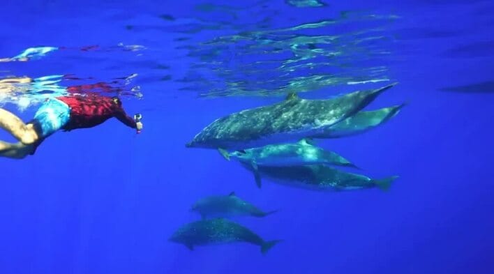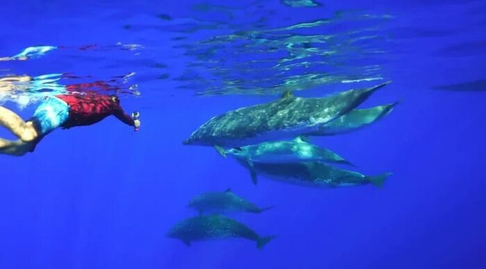 船に乗って海に出た坂上。そこで何かを発見、海に潜った坂上の目の前に現れたのは…コブハクジラの群れ。