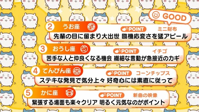 『めざましテレビ』で放送中の「ちいかわ占い」 テレビ放送がない日はお休みで、月~土:朝7時以降に更新予定です。