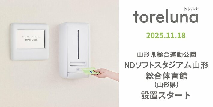 モンテディオ山形では、11月18日(火)より山形県総合運動公園内の主要施設である、NDソフトスタジアム山形および総合体育館に、トイレの個室で生理用ナプキンを常備し無料で提供するサービス「toreluna(トレルナ)」(以下 トレルナ)を設置し、サービスの提供を開始することをお知らせいたします。