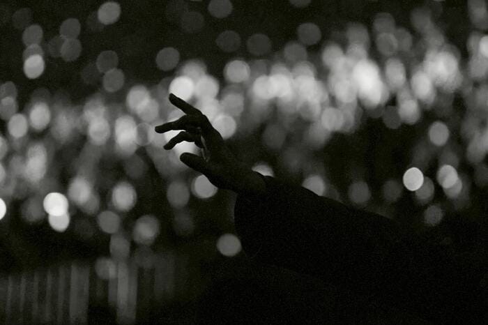 また、ファンのペンライトと思われる輝きが広がった景色をバックに、大森さんの手が伸びたショットも!しなやかに指1本1本伸ばしていて、なんとも魅力的な1枚です。
