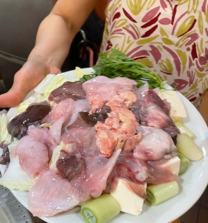 白い大皿には、豆腐、ねぎや白菜などお鍋に欠かせない野菜と、寒い季節が旬の食材であるあんこうがどっさり!