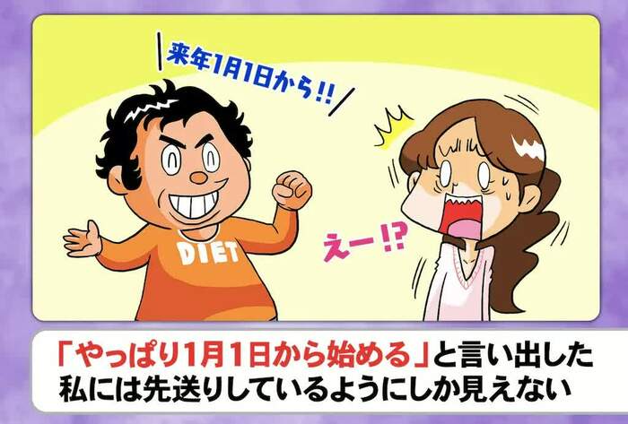 「太ったからジョギングをするという夫が、中途半端になりたくないから1月1日から始めると言っている。先送りにしているようにしか見えない」という妻の不満も登場しました。