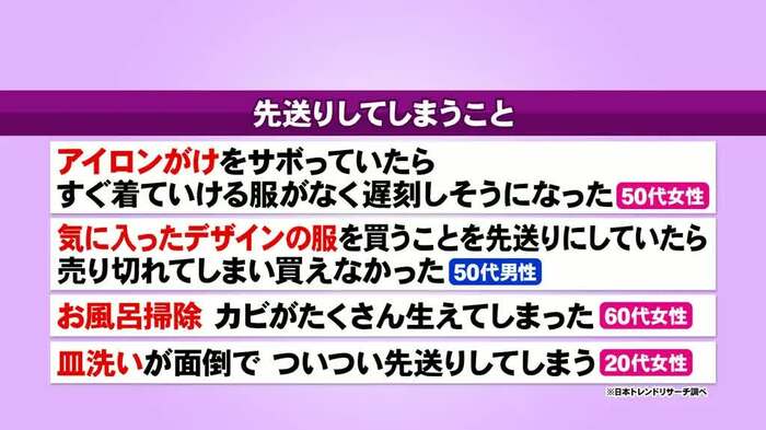 アンケート調査で明らかになった「つい先送りにしてしまいがちなこと」が紹介されると、虻川さんは「お風呂の天井の掃除の仕方を春ごろに教わって、試してみようと思っていたのに、もう秋…」と反省の表情に。
