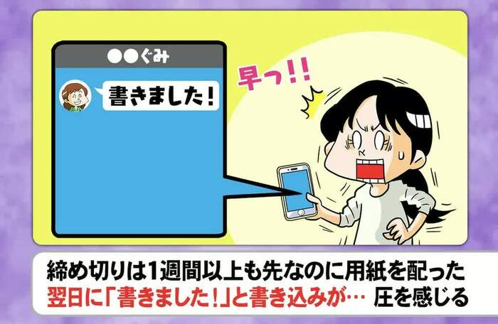 「保育園の先生に保護者からメッセージを送ることになったのだが、締め切りが1週間以上先なのに『書きました!』とクラスのLINEに書き込んでいる人がいて、圧を感じた」というエピソードも。
