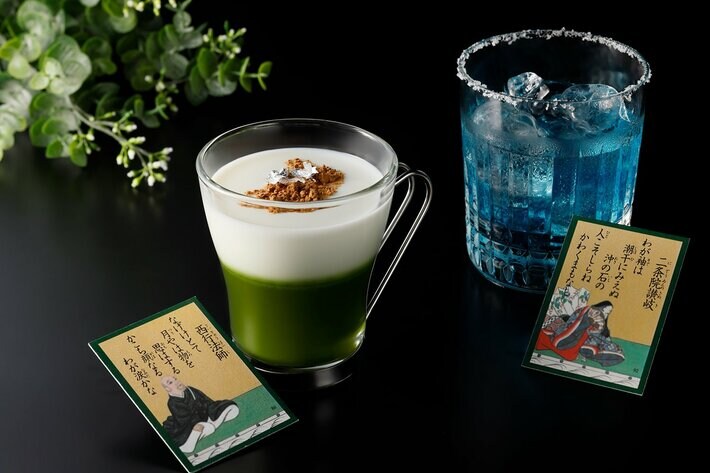(商品内容)薫り高い抹茶の上にミルクを注ぎ、冬の緑に降り積もる雪の情景をイメージしたノンアルコールカクテル。ホワイトチョコシロップの甘さで恋の余韻を、ほのかに香るバニラシロップで和歌の雅な世界を表 現しています。