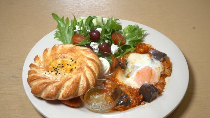 現地で主食として食べられている「ノン」というパンに…トマトやナスなどが入った煮込み料理「シャクシュカ」など、現地の朝ごはんがワンプレートに。