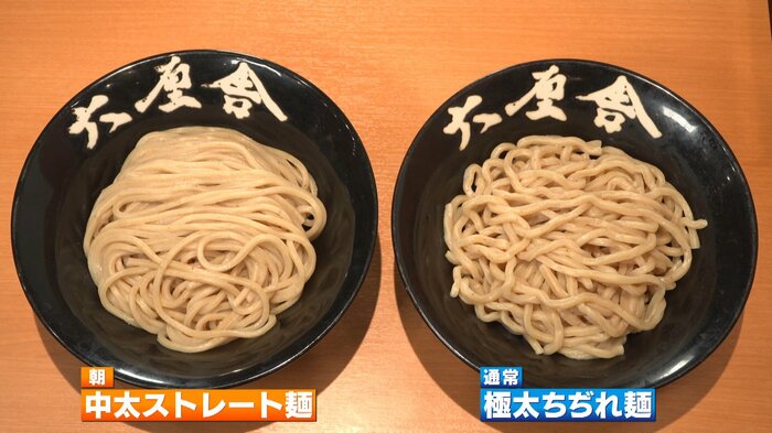 朝でも食べやすいように朝つけ麺専用の中太ストレート麺を開発。六厘舎の代名詞、極太ちぢれ麺と比べてもその差は一目瞭然です。