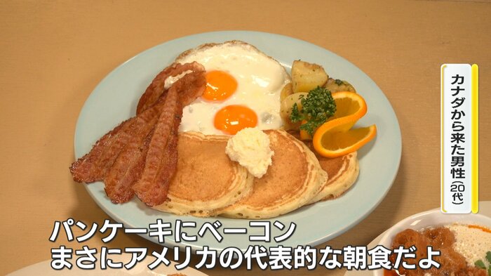 味が最高だね。パンケーキにベーコン、まさにアメリカの代表的な朝食だよ。