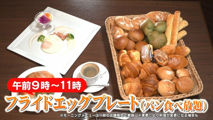 みなさんのお目当ては…午前9時から11時限定のモーニングプレート。フライドエッグプレートは15種類のパンが食べ放題で税込み1078円。