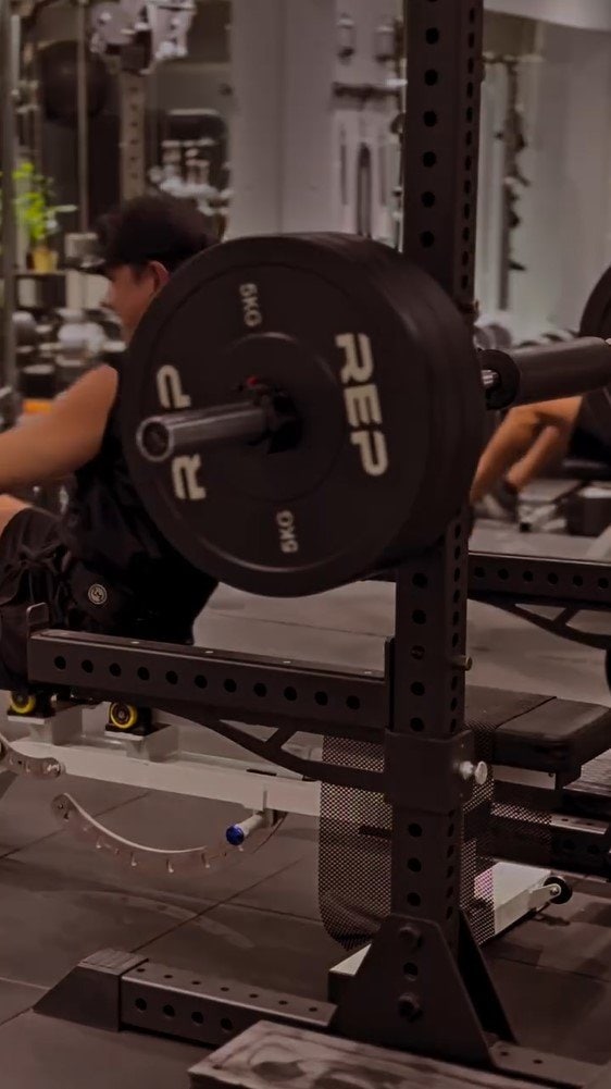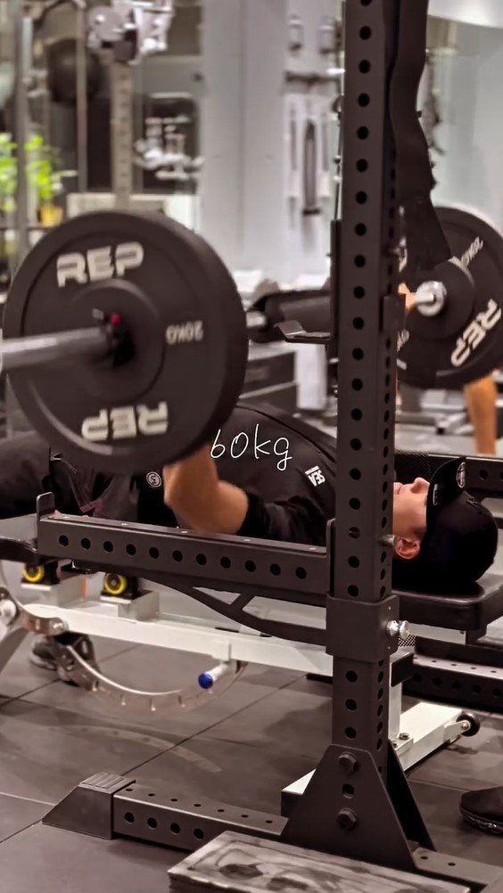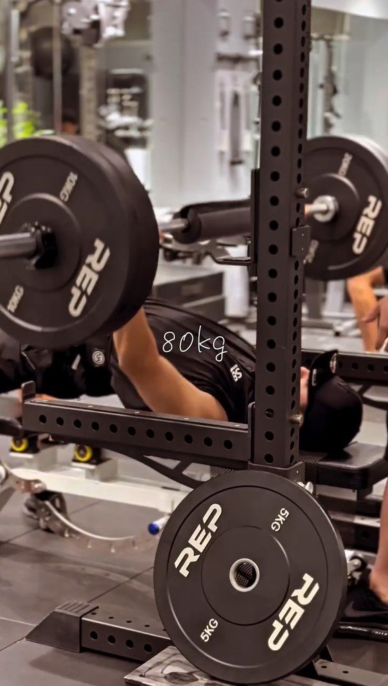 動画内では、斜めに設置されたベンチにあお向けになり、バーベルを持ち上げてベンチプレスをしている姿が披露されてました。バーベルには重量のあるウェートが取り付けられていて、三浦さんは頬を膨らませて力いっぱいに力んでいます。