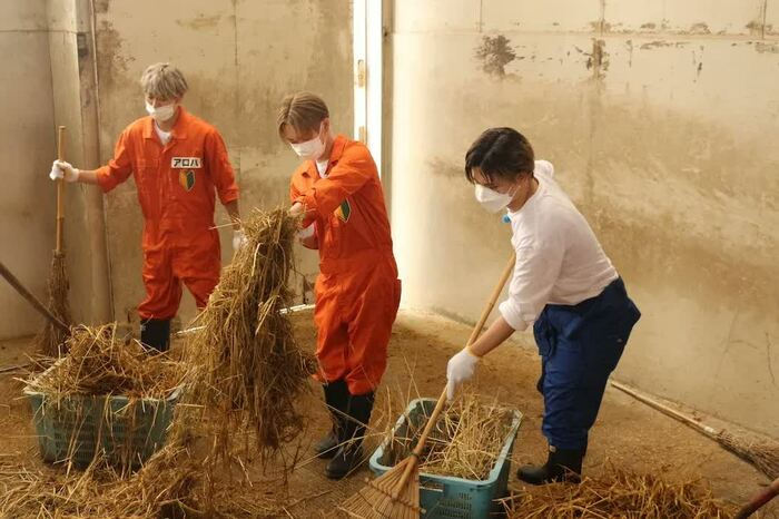 その後、5人はキリンが暮らす部屋掃除へ。部屋のなかに散乱しているワラを一箇所に集めていきます。想像以上の重労働にメンバーが苦戦するなか、いち早くコツをつかんだメンバーも現れます。