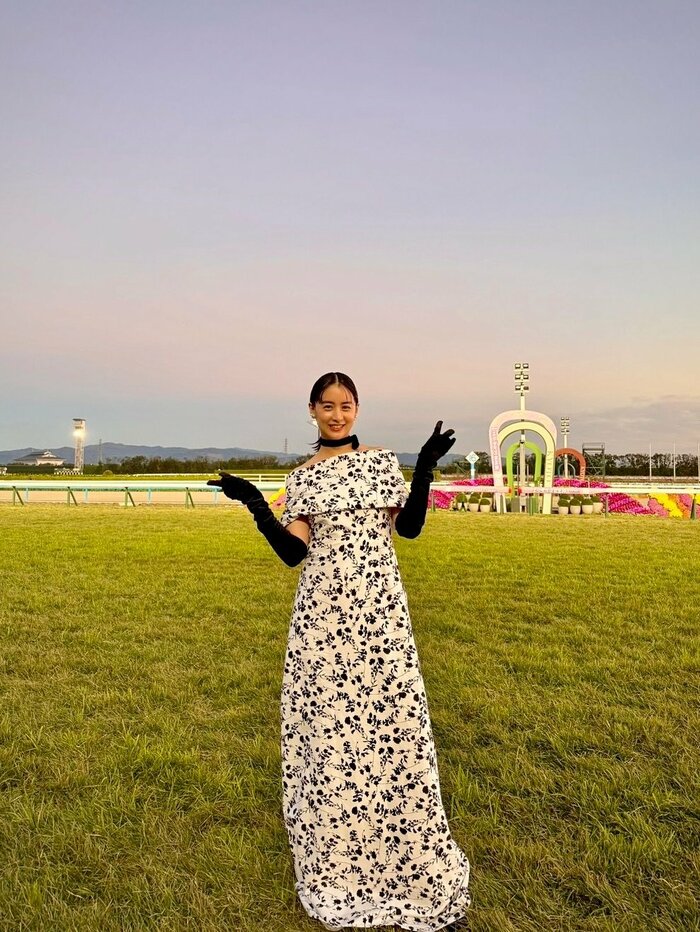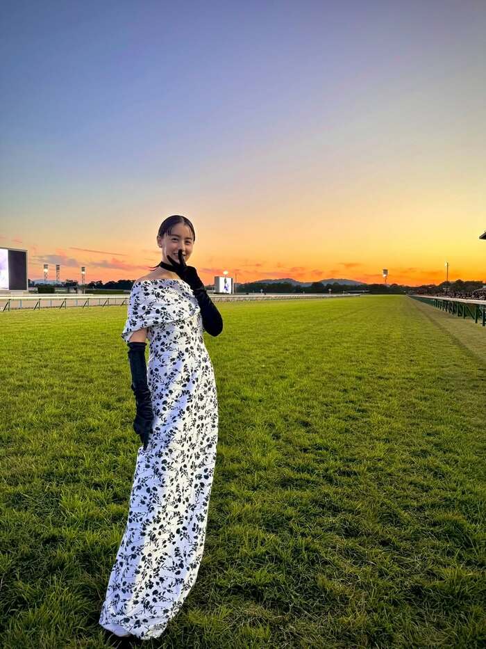 競馬場に人生で初めて訪れたことを明かし、美背中をチラ見せさせたエレガントな装いを披露しました。