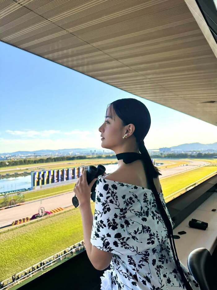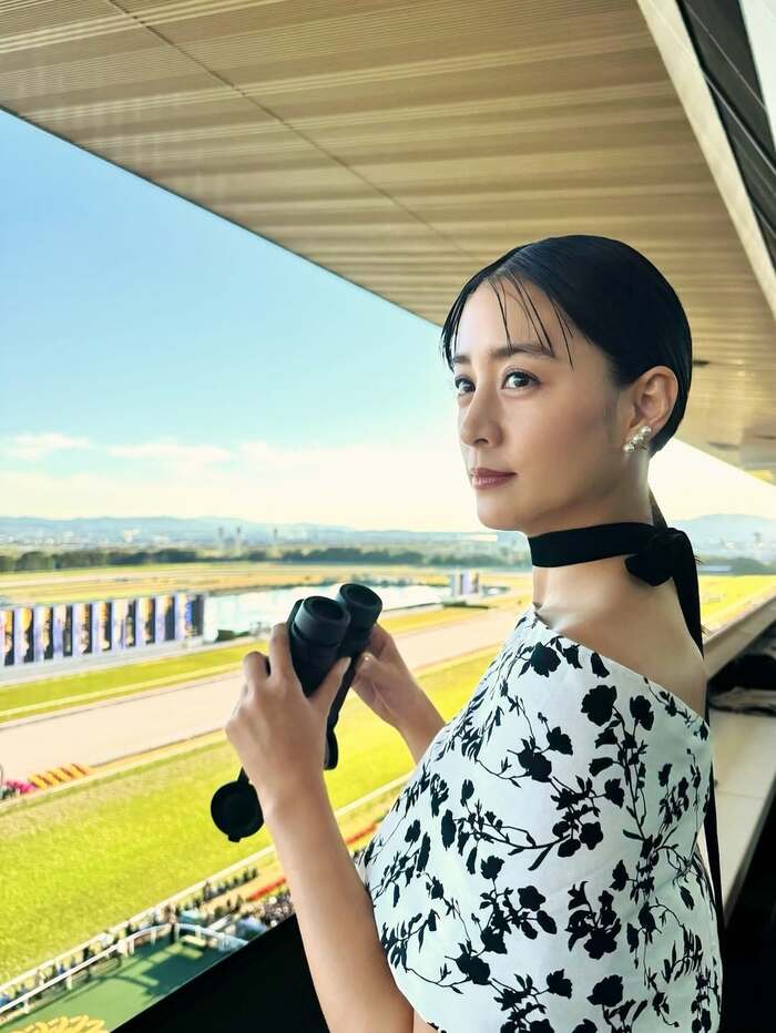 そして「天気も良く、気持ちの良い空間で、美しい馬たちにうっとりしました。」と、双眼鏡を両手で持ち、コースを眺めている様子も公開。