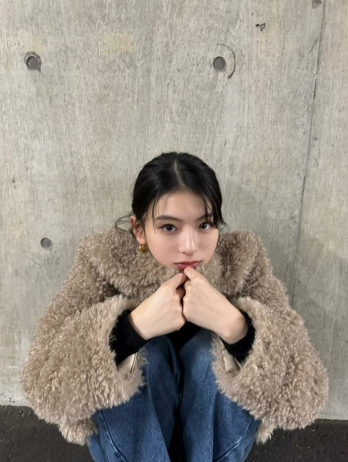 そこには、モコモコの茶色のアウターとデニムを合わせたコーデを披露する出口さんの姿が!