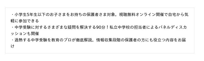 当社では8月にオンラインセミナーを開催し、私立中学校の先生方とともに最新動向や“新しい中受脳”の重要性をお伝えしました。低学年期に多様な経験を積むことが思考力の基盤となることや、子どもたちの学びをどう支えるかといった内容に多くの保護者の方から「最新の実情が参考になった」「現役の先生方の生の声が聞けて有意義だった」といった声をいただきました。今回はその8月のオンラインセミナーを複数の日程で配信いたします。無料で視聴できるため、急なご予定が入っても他の日程にお申込みいただければ貴重な情報を聞き逃すこともありません。受験を検討しているご家庭はもちろん、情報収集段階の保護者の方にも役立つ内容をお届けします。