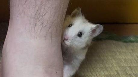 今回の写真は、散歩中に人が部屋に入ってくると、まろちゃんが人懐っこく寄ってきて脚を登ろうとした時に、飼い主が撮影したそうです。