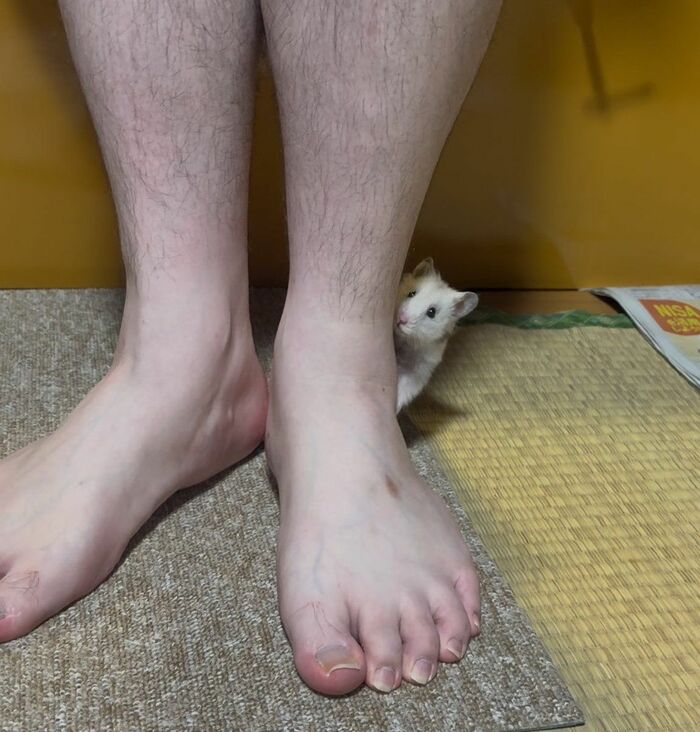 投稿された写真を見ると、部屋に立つ人の足の後ろから、ひょっこりと顔を出すまろちゃんの姿が!よりサイズが小さく感じられます。