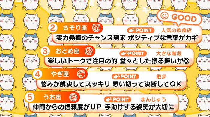『めざましテレビ』で放送中の「ちいかわ占い」 テレビ放送がない日はお休みで、月~土:朝7時以降に更新予定です。