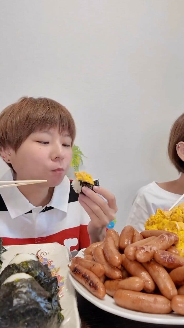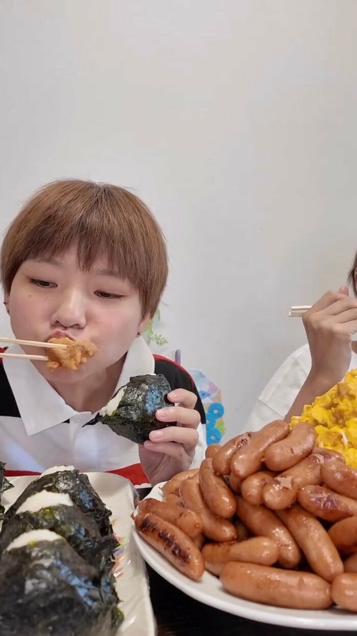 あこさんと一緒に手を合わせて「いただきます!」と始まった動画…、そんな二人の目の前にはすごい量のウインナーと卵焼きが山盛りに積まれていて、さらにその隣にはおにぎりがいくつも並んでいます。
