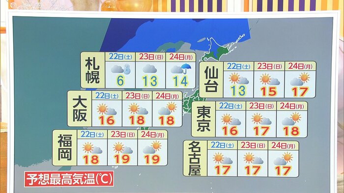 22日(土)~24日(月)の気温の変化をみると、きょう19日(水)・あす20日(木)はまだ寒いんですけれども、札幌から福岡にかけて結構気温が上がってきます。福岡は最高気温20℃近くまで上がります。