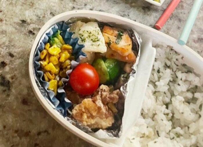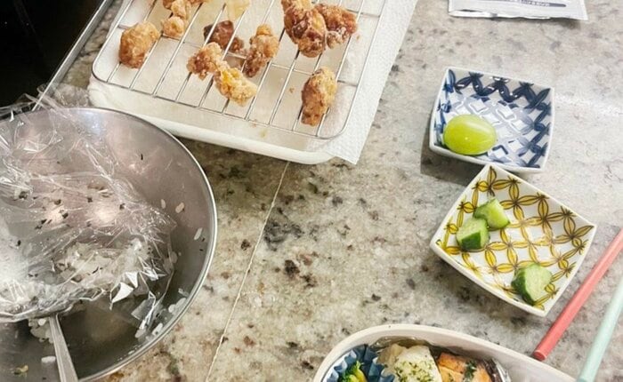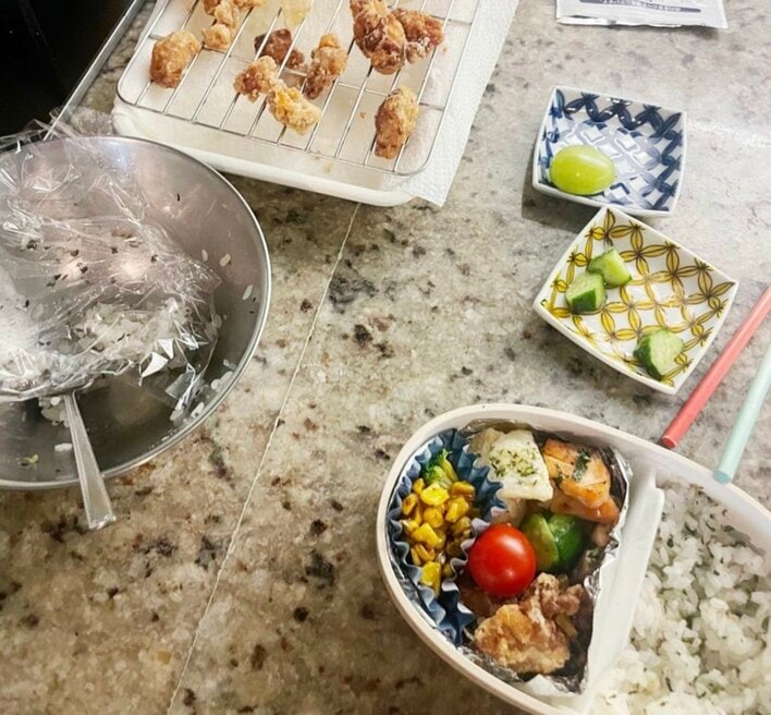 しかしその周りを見てみると…バットにあげた唐揚げや、きゅうりの漬物。さらにはボウルの中で混ぜ混ぜしたご飯など、お弁当箱に詰める前のおかずたちがそのままに置いてあり、朝のバタバタぶりが伺えます。