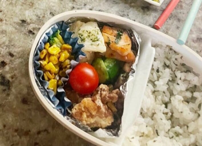わかめご飯に、唐揚げ、コーンにブロッコリー。オレンジ色は鮭でしょうか?