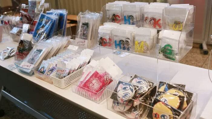 番組の人気キャラクター「はっちゃん」のイラストを使用したものや、3人の要望から生まれたグッズも多く、全59点ものオリジナルグッズが並んでいる様子は壮観。