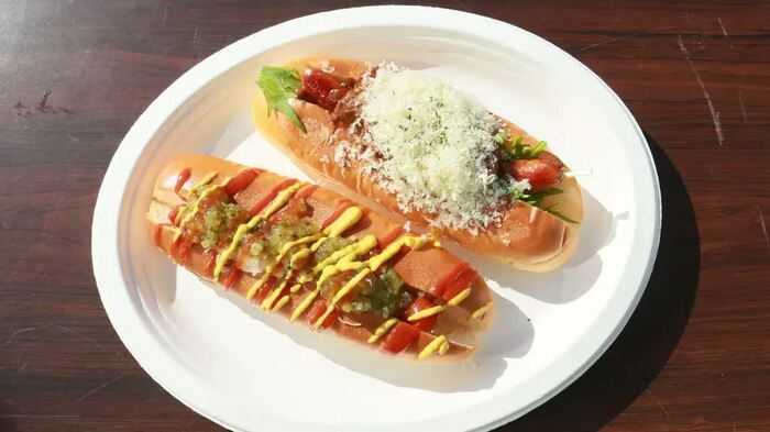 ホットドッグは定番商品の『こじらせ久保ドッグ』と、ふんだんにかけられたパルメジャーノチーズがまるで雪のような、クリスマスを意識した新メニュー『デミグラドッグ~粉雪~』が販売され、行列をなしていた。