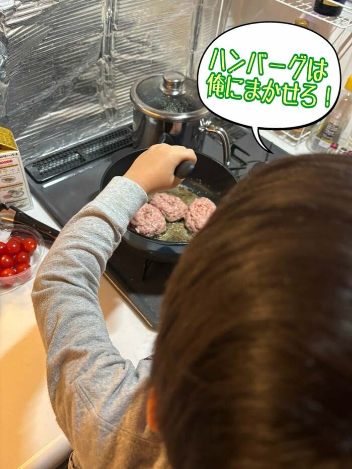 そして今回の投稿では「夕ご飯はハンバーグと伝えると、とっちゃんが『手伝いたい!!』との事で、焼くところをお願いしました」とつづり、長男が料理する姿を公開。
