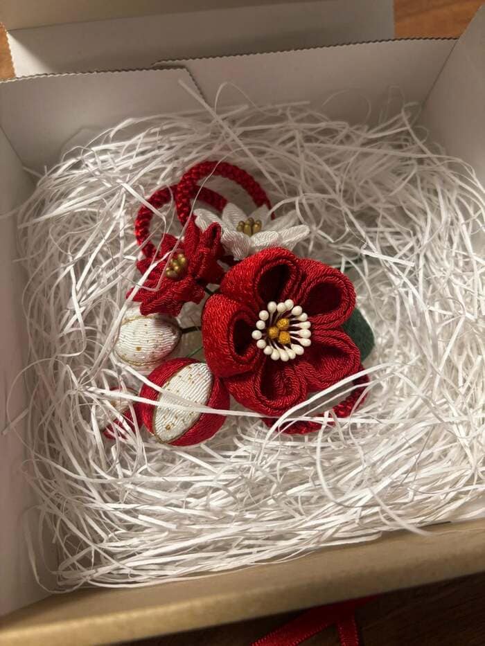 さらに、「かーわーいーいー 長く使えたらいいな」と、真っ赤なお花の髪飾りも披露。