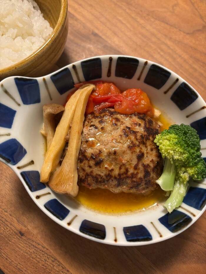 お皿には、焼き目も付いた、ふっくらジューシーなハンバーグが盛り付けられています!