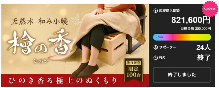 本製品は、10月1日より応援購入サービス「Makuake」にて先行販売を実施し、目標金額に対し273%を達成してプロジェクトを終了しました。ひのきの香りとぬくもりが支持され、多くのご支援をいただきました。