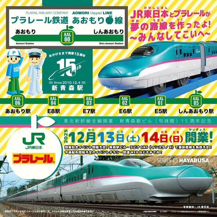 ○株式会社JR東日本青森商業開発(社長:真壁まり子/所在地:青森県青森市)、東日本旅客鉄道株式会社盛岡支社(執行役員盛岡支社長:大森健史/所在地:岩手県盛岡市、以下、「JR東日本盛岡支社」)および株式会社タカラトミー(代表取締役社長:富山彰夫 /所在地:東京都葛飾区)は、15周年を記念し2025年12月13日(土)・14日(日)の2日間限定で記念イベント「プラレール鉄道あおもり線~東北新幹線全線開業・新青森駅ビル(あおもり旬味館)15周年記念イベント~」を開催します。