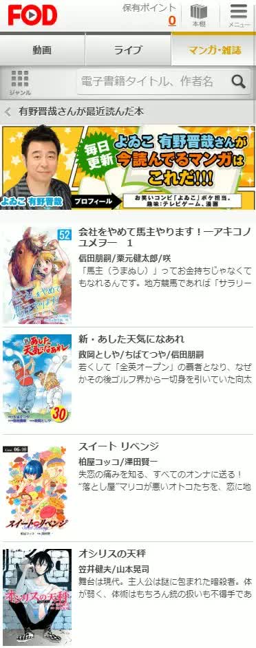 12月24日(火)より、 フジテレビが運営する動画配信サービス「FOD」の電子書籍サービスにて、FODを利用している芸能人や著名人が、毎日どんなマンガや小説を読んでいるかわかる新コーナーが設置される。