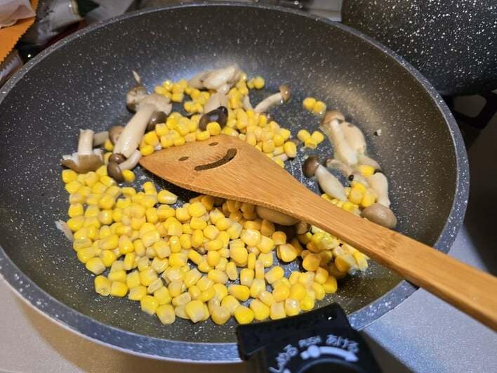 「シメジや コーンを炒めて、、」と、写真にはにっこりマークの木べらを使って、大きなフライパンで炒めている様子が収められています。