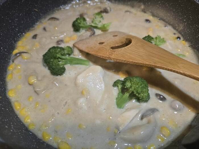 最後にはゆでた豆パスタとクリームソースを混ぜていき…。