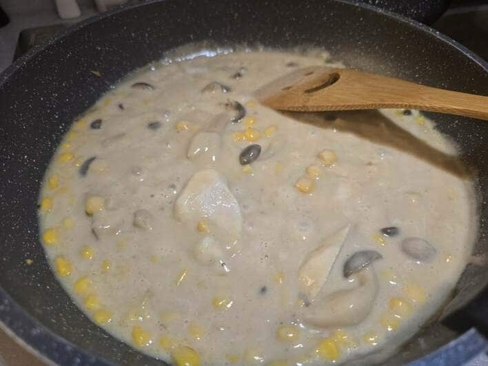 クリームソースを入れて、ぐつぐつと煮込みながら、冷蔵庫にあったサラダチキンを加えたり…。