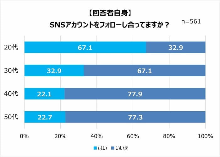 SNSアカウントをフォローし合っているかについて聞くと、「はい」と回答した人は全体で36.3%と少数派でした。一方で、回答者自身の結果を年代別に見ると、40代、50代は約2割と少ないのに対し、20代は約7割の人が相互フォローしていることが分かりました。