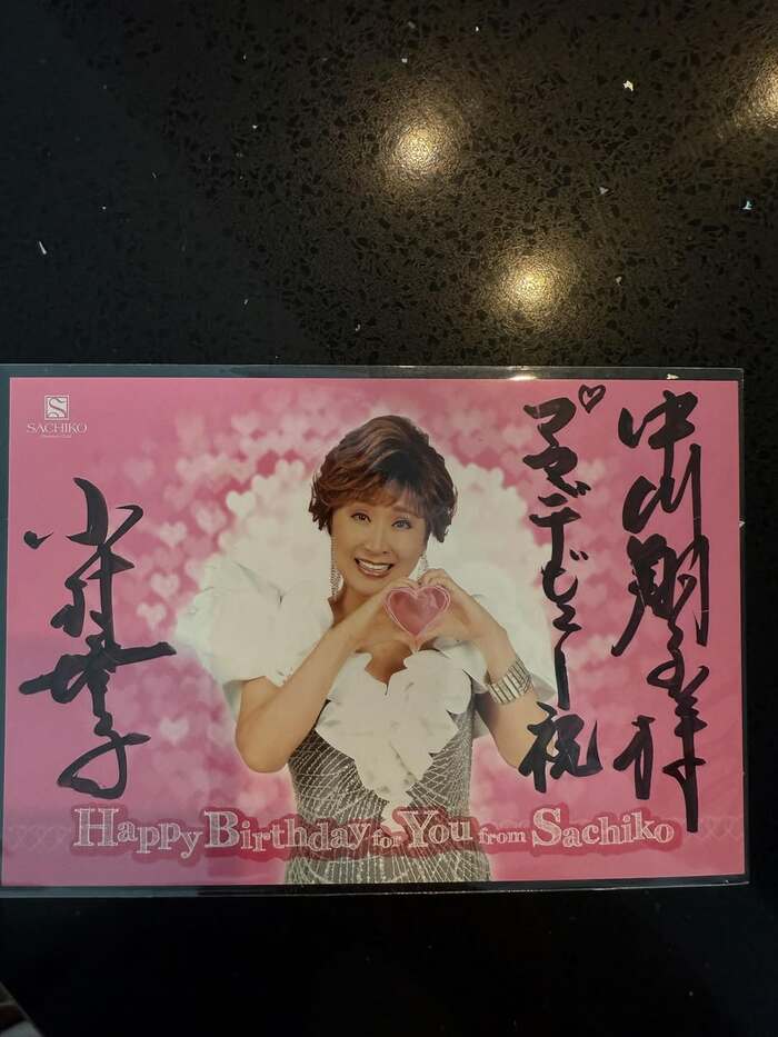 タオルと一緒にもらったと思われる小林さん自身がうつるメッセージカードには、「中川翔子様 ママデビュー祝 小林幸子」と達筆がそえられていました。