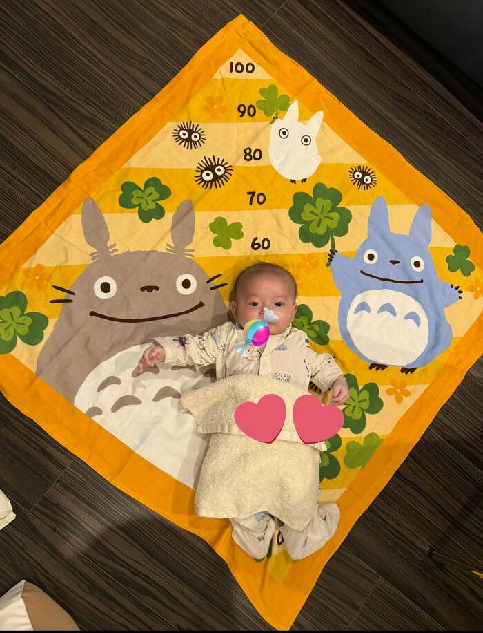 公開されたのは、小林さんからもらったタオルの上に弟くんが寝転がっているショット。オレンジ色ベースのタオルに、大中小のトトロ&ススワタリのイラストが描かれていて、とってもキュートです。中川さんは、「ありがとうございます 超かわいいです トトロ!!かわいいーー キュンキュン 小さい頃トトロ大好きで毎日何回もみてたから双子に絶対みせたい、、」とすっかりお気に入りの様子。