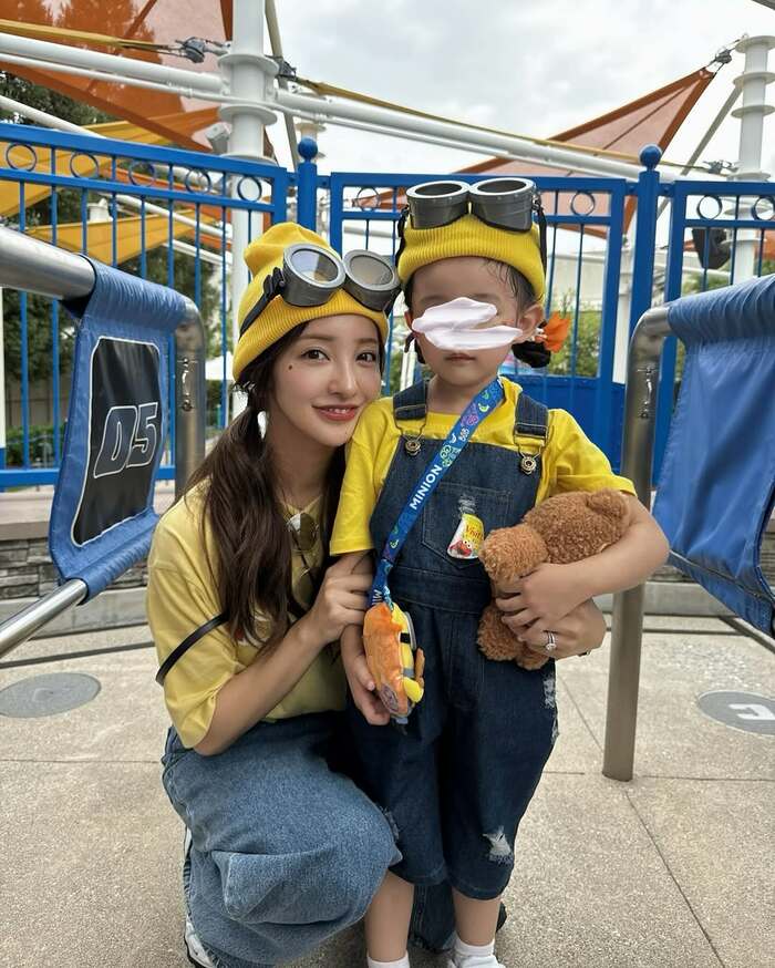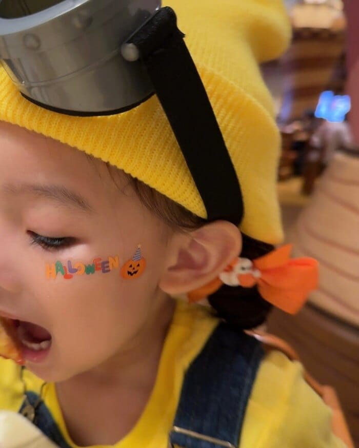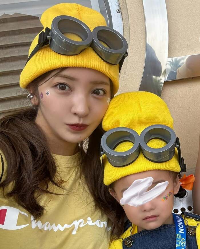 ベビちんと2人で黄色いTシャツにオーバーオール、頭には黄色のニット帽をかぶり、ミニオンズがいつもしているゴーグルも装着。お揃いのミニオンコーデで、親子2ショットを披露しました。