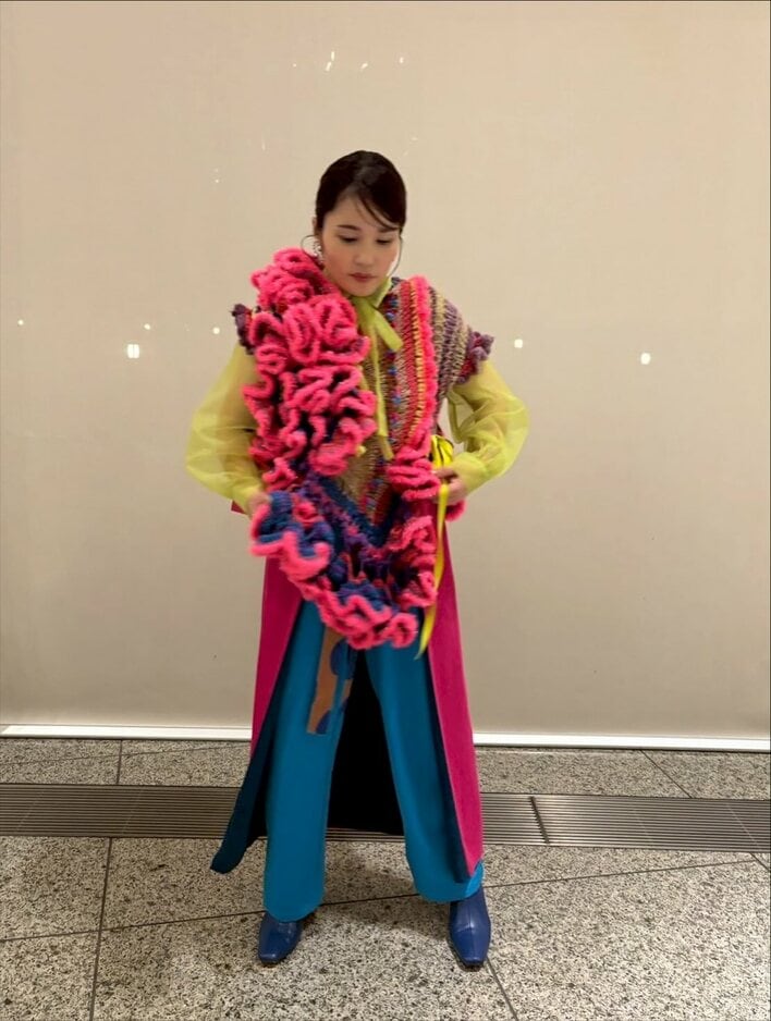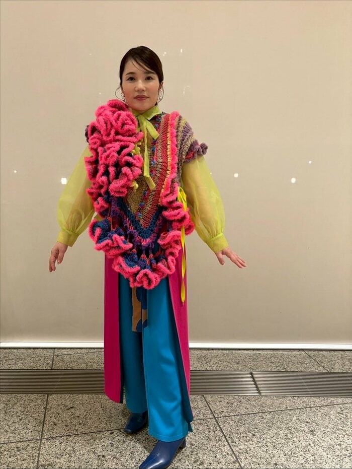 どうやら黄緑色の透け感ブラウスの上に、ピンクのフリルが大量に付いたセーターを着ているようで、不思議と“腸”に見えてしまいます。